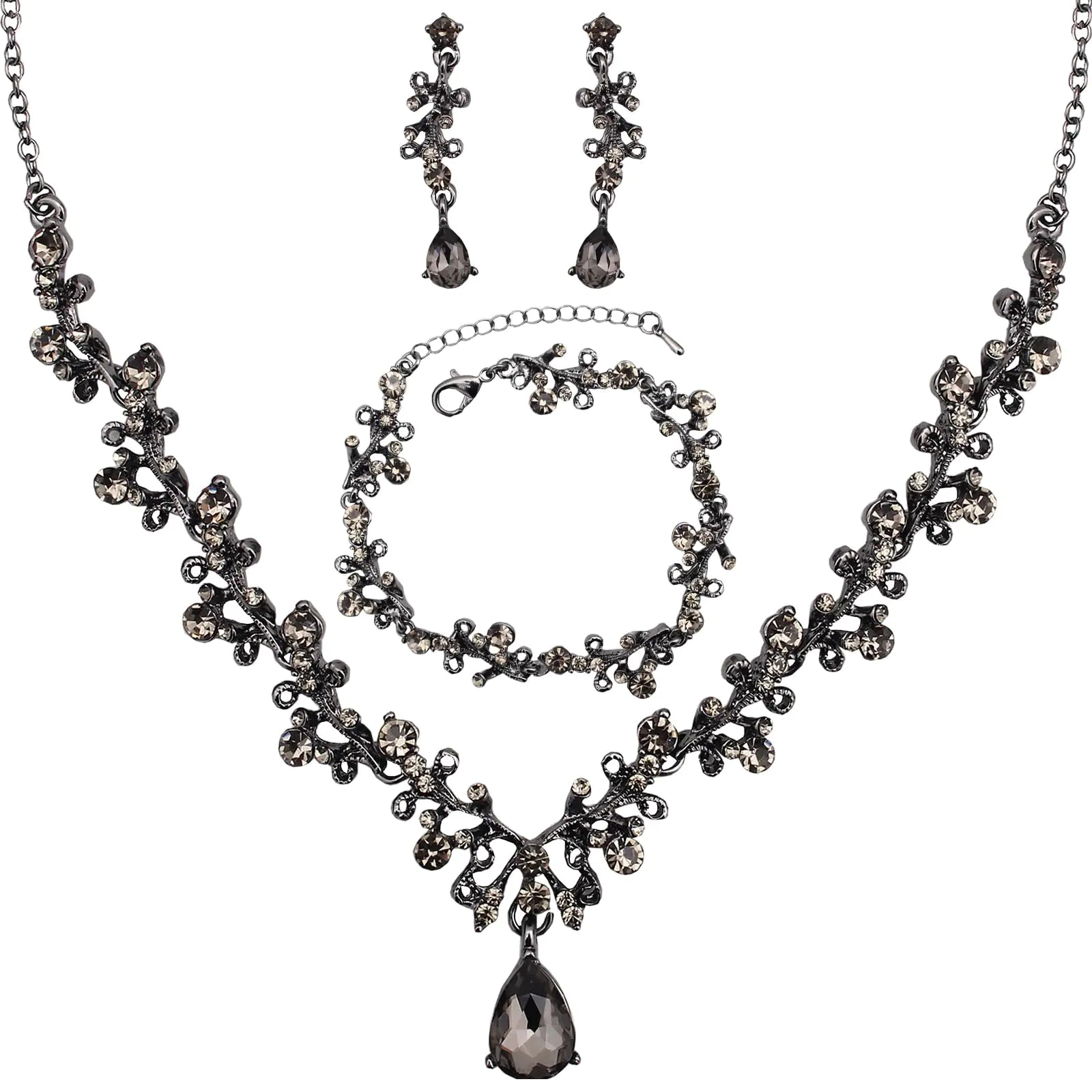 3Pcs Austrian Crystal Jewelry Set for Women Necklace Dangle Earrings Link Bracelet Jewelry Set with Gold/Platinum/Gun Plated Wedding Party Jewelry for Bridal Bridesmaid (Black Diamond-Jet)