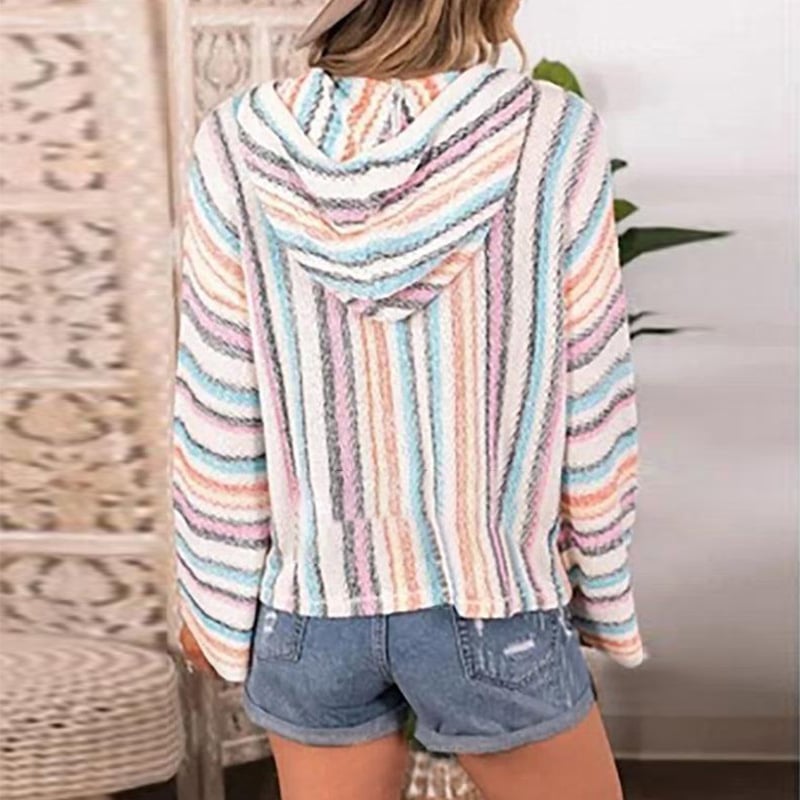- Unique hooded design with a vibrant rainbow stripe pattern