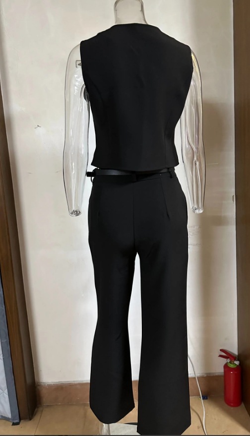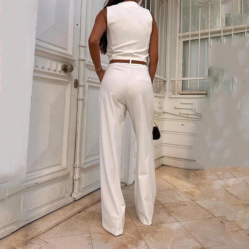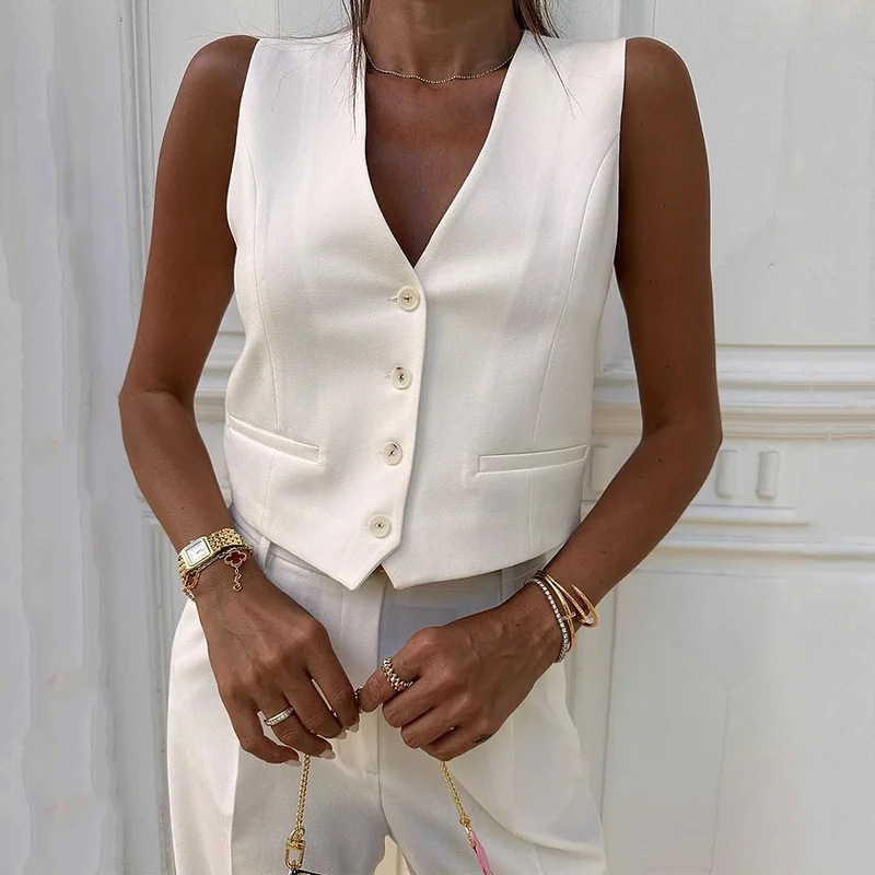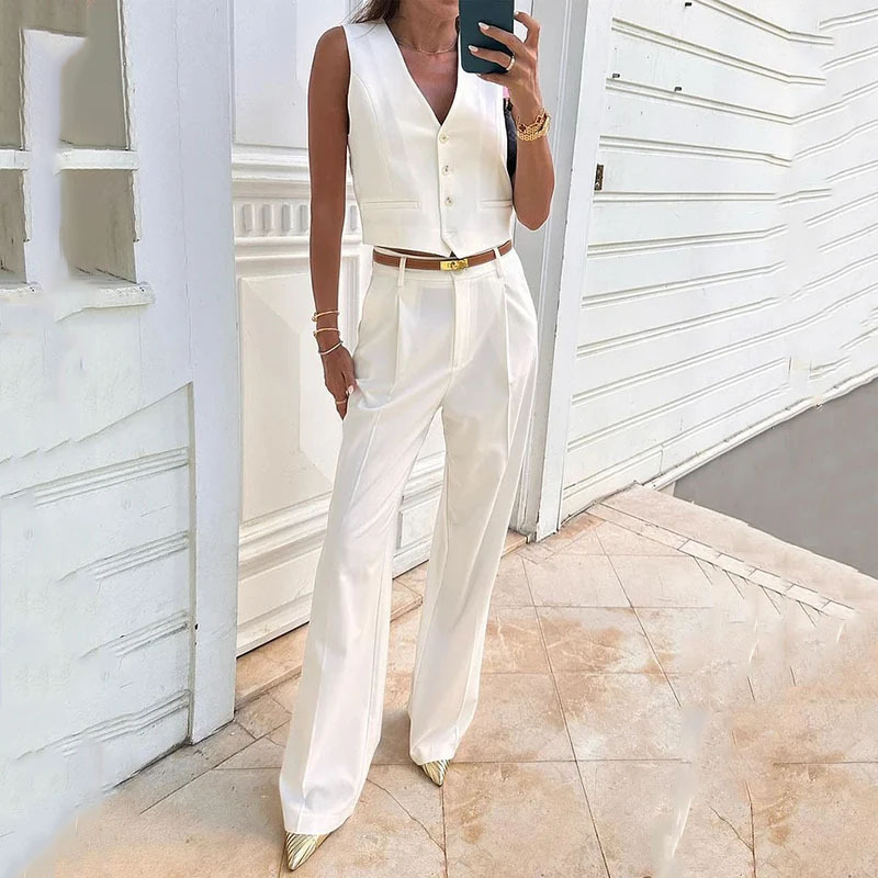 Summer Womens Solid Color Button Vest Set Elevate your wardrobe with our 2023 Summer European and American Style Pure Color Button Design Slim Fit Vest and Suit Set. Perfect for the modern woman, this chic ensemble is designed for those who appreciate timeless elegance and versatility in their daily commute or special outings.